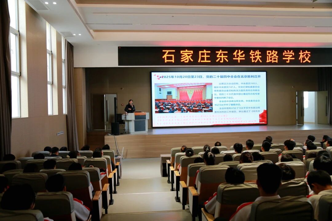 为全面学习贯彻党的二十届四中全会精神,凝聚奋进力量,推动学校事业高质量发展,2025年12月10日,石家庄东华铁路学校在多功能报告厅举办党的二十届四中全会精神宣讲活动。河北中华职教社有关领导、学校中层以上领导干部、党员教师及共青团员代表共360人参加。学校党支部副书记康力军主持宣讲报告会。