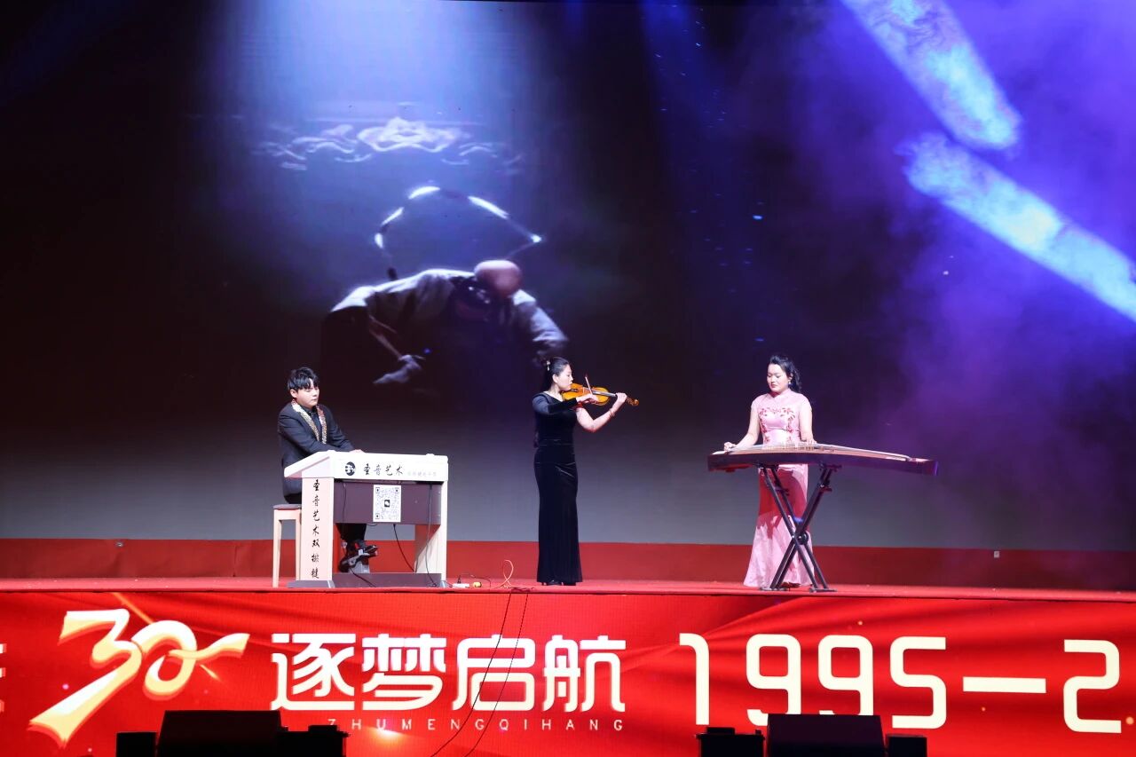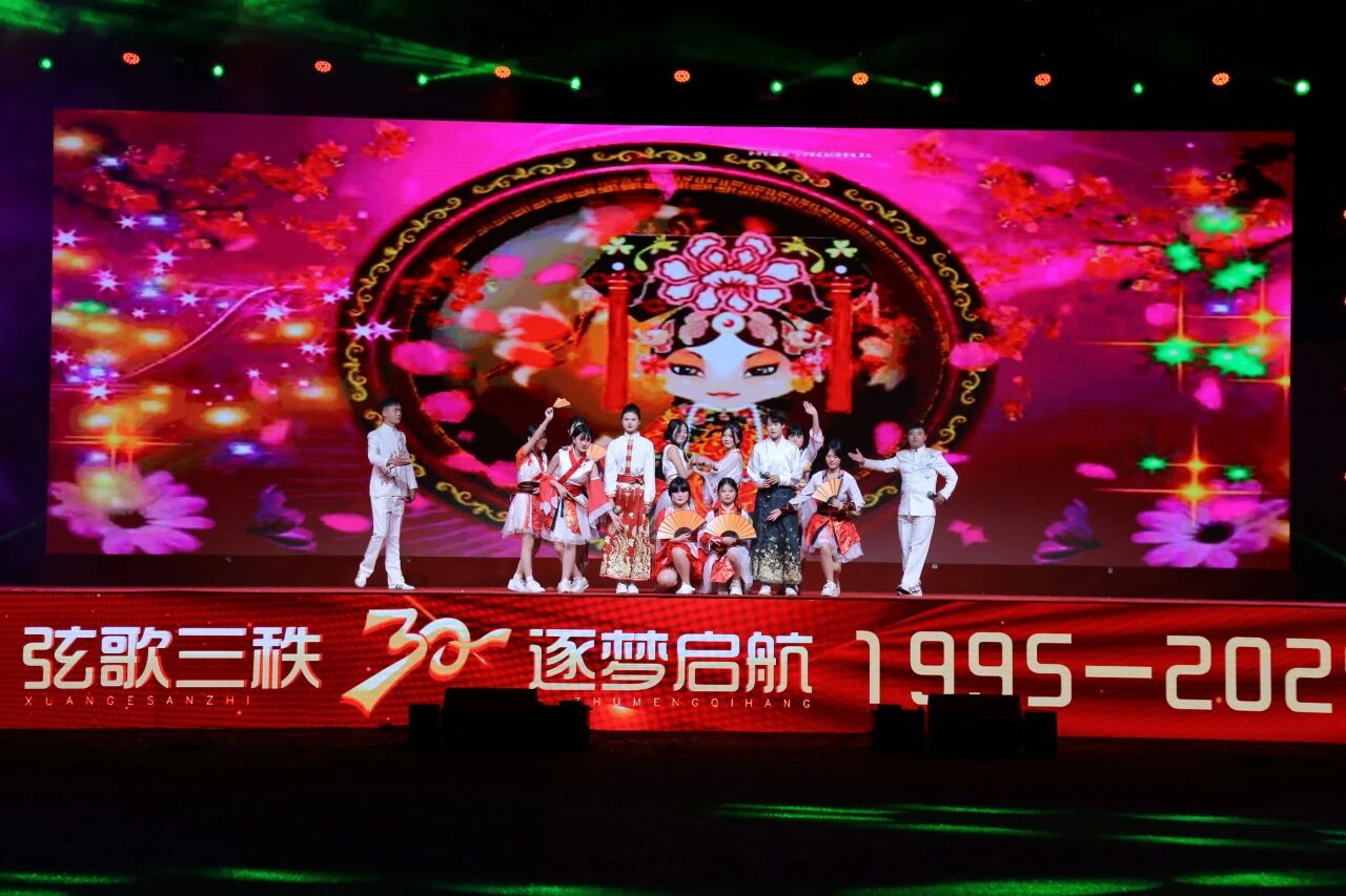 当晚的文艺晚会将庆典推向高潮。师生自编自演的歌伴舞、快板、朗诵,以及我校合作院校的师生,亲情奉献的器乐合奏、拉丁舞、爵士舞、配音秀等节目精彩纷呈。建校初期的校友和老师共同朗诵《东华之光、三十华章》,引得全场共鸣。尾声时,校领导班子全体成员与师生同台演唱,为庆典画上圆满句号。