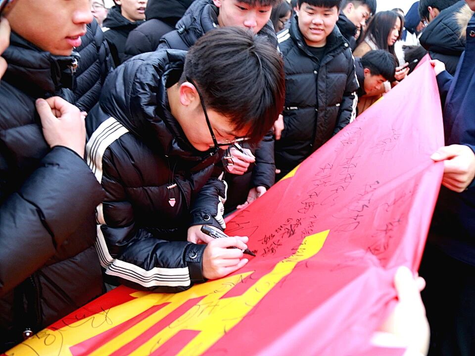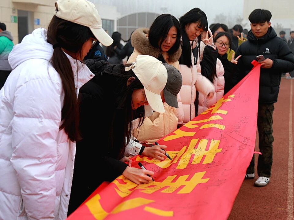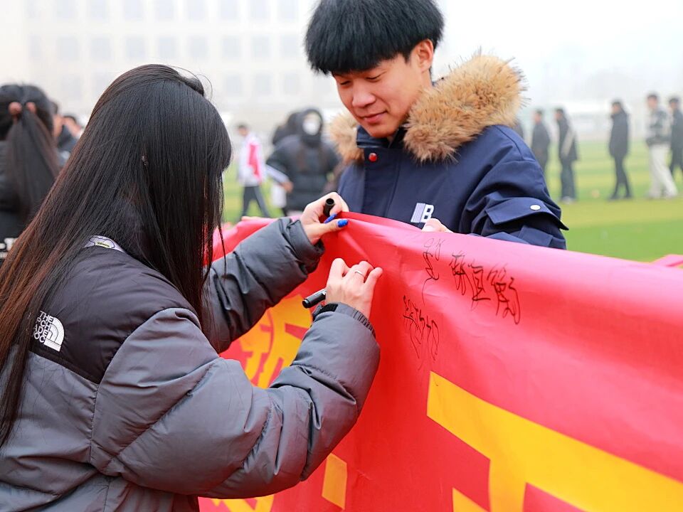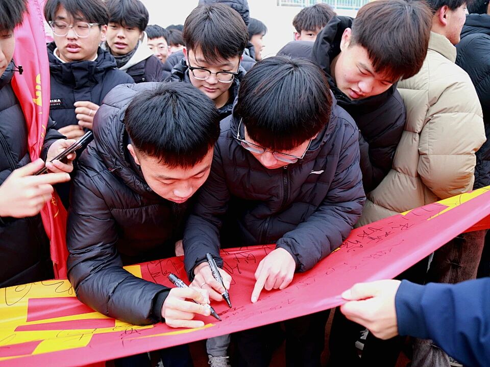 紧接着,各班级学生代表有序上前,在印有“我以青春之名立誓:百日冲刺,砥砺锋芒;知识为刃,未来可期!”字样的巨型励志横幅上郑重签下自己的名字。一个个签名,是承诺,更是迈向成功的坚定步伐。