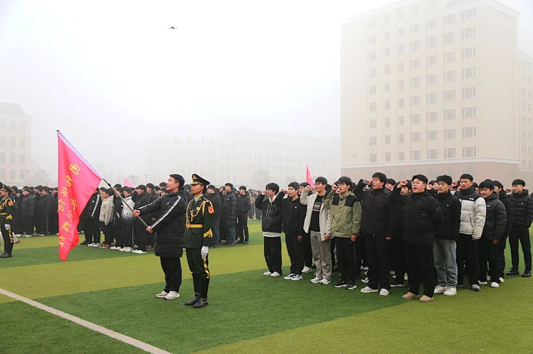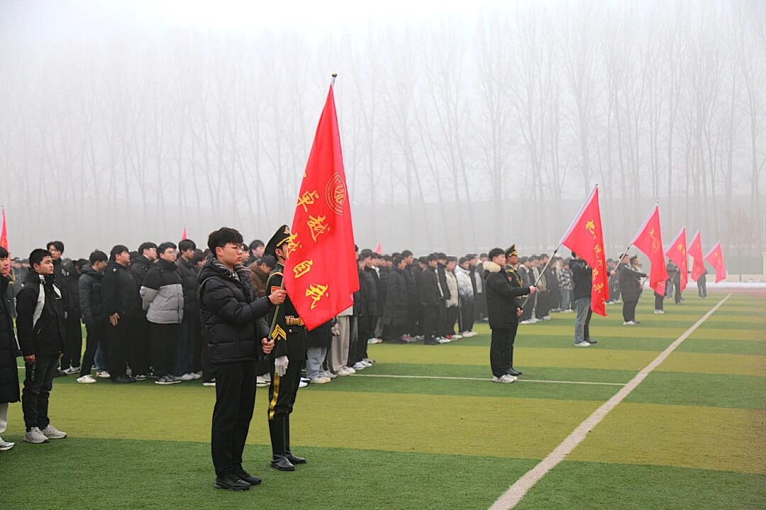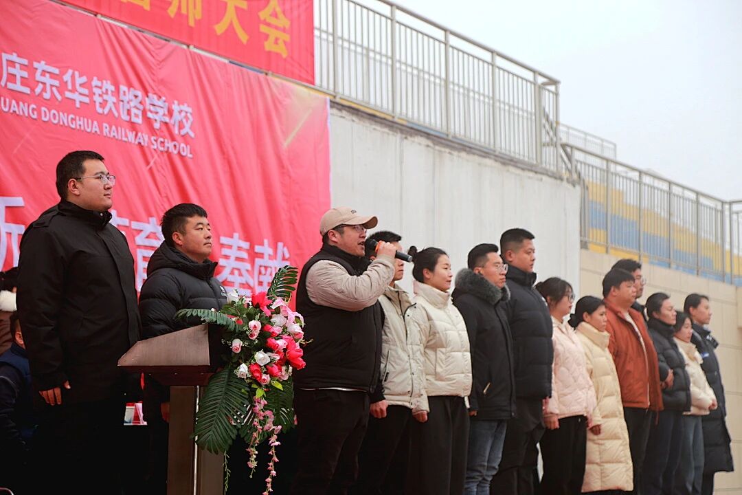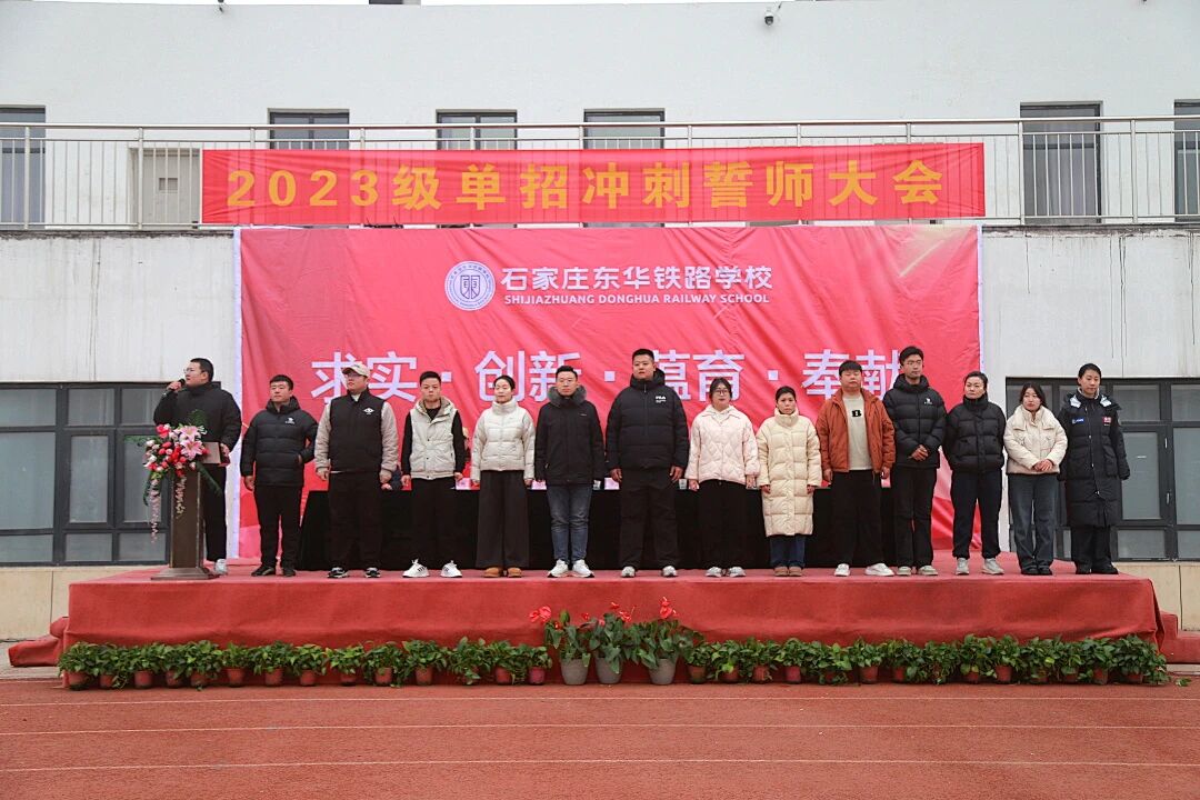 为鼓舞2023级学生单招备考士气,坚定冲刺信心,营造奋发向上的迎考氛围,石家庄东华铁路学校于2025年12月18日下午15时18分,在学校田径场隆重举行了“百日砺剑 单招必胜”单招冲刺誓师大会。学校教育教学副校长李沫达、教学管理副校长赵雪峰、学生管理副校长马长青等校领导出席大会,三年级全体师生共同参加了这一振奋人心的活动。大会由三年级教学副主任母丹主持。