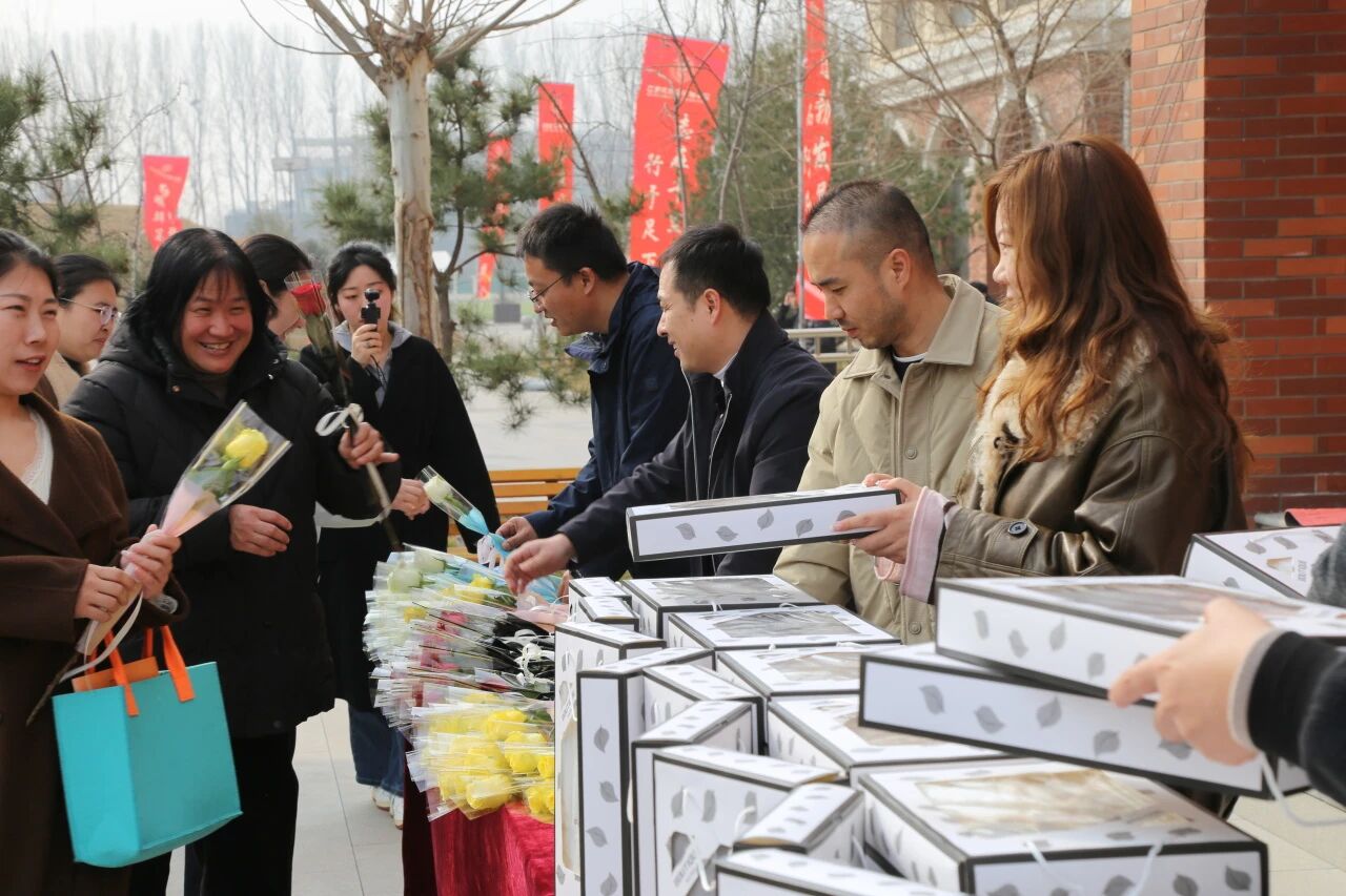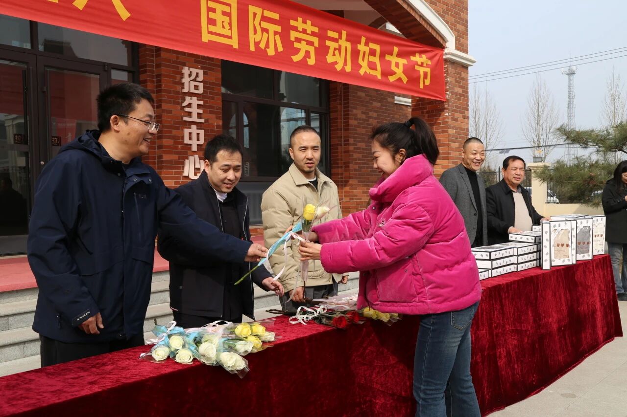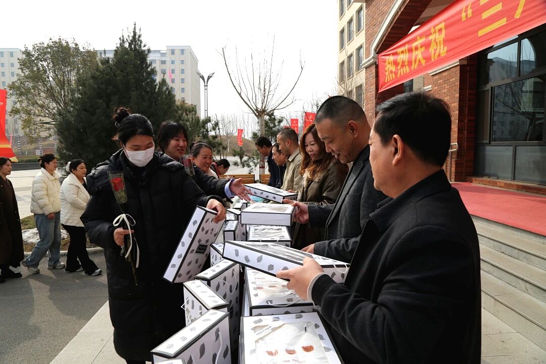 上午的大课间,校园里一片欢腾。全体校领导齐聚一堂,共同出席这场充满温情与仪式感的节日庆典。校领导们亲手将一束束芬芳的鲜花和一份份精美的礼品,送到每一位女教职工手中,并向她们致以节日的美好祝愿和崇高敬意。鲜花映衬着笑脸,礼品承载着心意,现场气氛热烈而温馨。