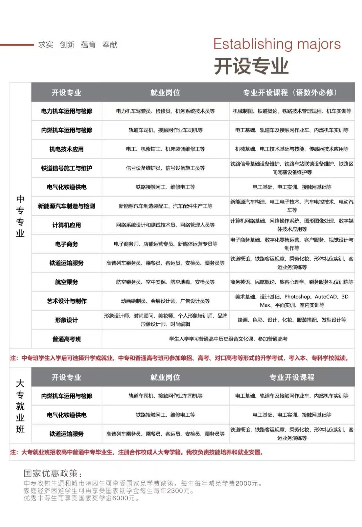 经教育主管部门批准成立的一所全日制学校,设有中专部、升学部、3+2。是一所以铁路专业为主,集机械、能源电力、计算机、社会服务、艺术、财经等多种热门专业为一体的综合性院校。